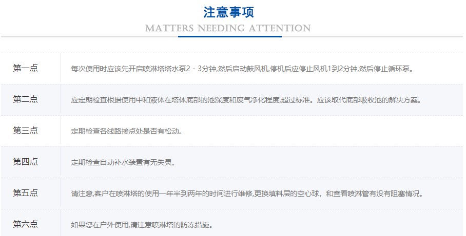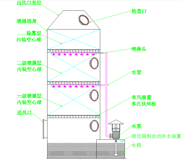 經(jīng)過噴淋后的水霧再在洗滌塔內(nèi)的填料層(空心球)內(nèi)形成一個多孔接觸面較大的處理層,進一步的使氣體處理。水霧經(jīng)過填料層后全部回到洗滌塔底部的水箱內(nèi)循環(huán)利用。廢氣由下而上穿過填料層循環(huán)吸收濟由塔頂通過液體分布器,均勻地噴到填料層中,沿著填料層表面向下流動,進入循環(huán)水箱.由于上升氣體和下降吸收濟在填料中不斷接觸,上升氣流中流質(zhì)的濃度愈來愈低,到塔頂達到排放要求