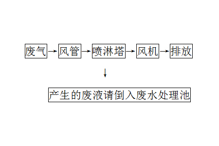 車間無機廢氣通過吸氣罩收集,在排風機作用下,經(jīng)過管道輸送進入噴淋塔裝置,無機污染物被噴淋塔噴淋凈化吸收,凈化后的氣體經(jīng)風機增壓后達標排放。噴淋塔處理后的廢液,請倒入廢水處理池。