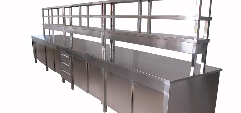 不銹鋼臺面:采用S304不銹鋼四邊折彎內襯18-25MM夾板制作(刨花板、中纖板、實芯理化板、環氧樹脂板、千思板、陶瓷板等臺面,根據客戶需求提供);